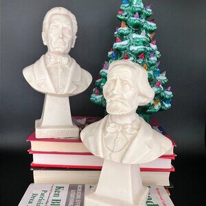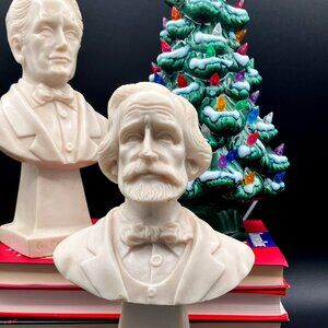 2 lovely statues Guiseppe Verdi 1813-1901 The most important composer of the period H- 7.75" L- 5" - W 3.25" Weight- 2 lb 1 oz Giacomo Puccini 1858-1924 -Madama Butterfly H- 8" L- 4.75"- W 3.5" Weight- 2 lb Puccini has a small chip on his nose. Imported specifically for Levitz Made in Italy