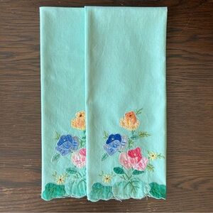 Set of 2 Green Vintage Hand-Embroidered Tea Towels – Floral Appliqué & Scalloped Edge