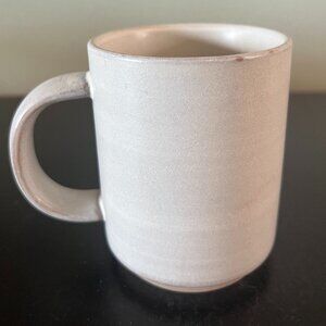 Pair of Hearth & Hand creamy white stoneware mugs with a simple, yet stylish, rustic distressed look and a nice heavy pottery feel. Sits on an unglazed base, with an unglazed underside. Comfortable, easy-to-grip C-shape handle. Dishwasher and microwave safe Microwave and dishwasher safe. Measures 4” tall with a 3” diameter; 4.5” across including handle. Holds 13 fluid oz. Please note: Each mug has a narrow dark ring around the wall at the interior bottom. I am not sure if this is a result of utensil use or a natural part of the glazing process.
