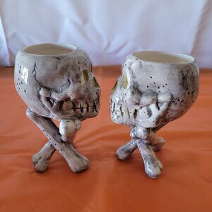 Set of 2 Halloween Skull Ceramic Votive or Tea Light Candle Holders
