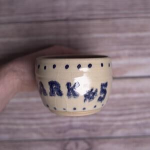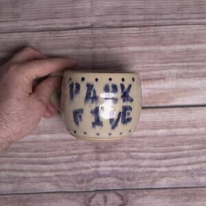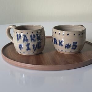 This is a charming set of hand-thrown pottery coffee mugs, each featuring a rustic “Park 5” or “Park Five” design in neutral clay tones with blue ink accents. These mugs are signed RS on the bottom, indicating a unique artisan touch.