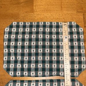 These cloth placemats are an adorable green and cream plaid with heart shaped arrow pattern on one side and matching green and cream checkered plaid on the back. The cloth napkins are the same heart and arrow green and cream plaid. Each napkin is handmade therefore they’re slightly different sizes.