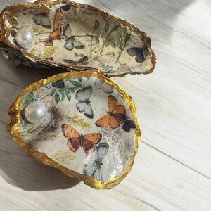 Set of 2 Handmade Decoupage Oyster Shell Trinket Dishes Butterflies Pearls