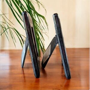 Add a pop of color to your space with this vibrant set of 2 ceramic tile picture frames. Each frame features a handpainted geometric mosaic design in orange, blue, pink, and black, with a glossy finish and charming crackle glaze details. Made to stand on a tabletop, these frames include back easel stands.
