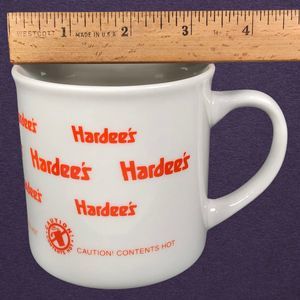 Set of 2 Hardees Caution! Contents Hot Coffee Cup Mug White Orange
