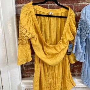 They have a crocheted sleeve and in really nice condition and are perfect for any outing. They fit off the shoulder and have a bell sleeve. They also tie around the waist for style and not functionality. They have a flow loose fit with an elastic waist.
