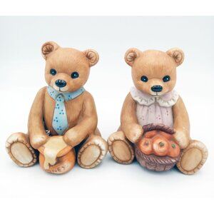 This vintage 80s Homco bear set includes a Mama bear with apples and a Papa bear with a honey pot, both measuring 4 inches. Beautifully detailed and nostalgic, they add a touch of charm to any decor.