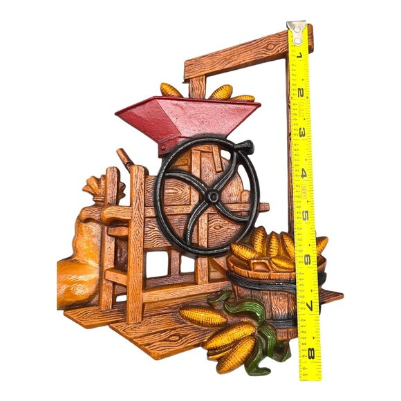 This charming vintage Homco wall decor set features a country apple cider press and corn grinder. Crafted from durable resin, these pieces add a rustic touch to any kitchen or living space. The vibrant colors and intricate details capture the essence of pastoral life, making them a delightful addition to your home.