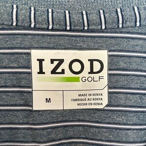 This is an IZOD men's golf polo shirt in size M, designed for regular fit. The shirt features a color combination of grey, white, and blue, making it stylish for on and off the golf course. It is suitable for golfing activities due to its performance fabric. With the iconic IZOD brand, this polo shirt combines both style and functionality for the modern man's wardrobe.