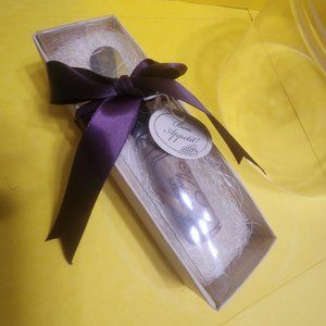 Comes in a beige wood-grain, pattern gift box with a clear Lid, a bed of natural raffia, purple ribbon and bow, and a tag with a wine-grape motif and the words "Bon Appetit!"
