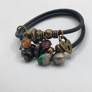 Materials: leather, charm Length: 8 in Clasp: slide on Signed? no Excellent vintage condition