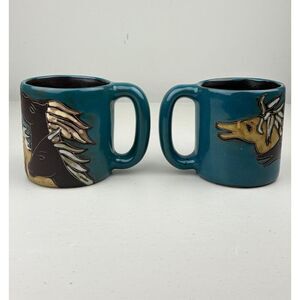 Set of 2 Mara Mexico Art Pottery Western Horse Stoneware Coffee Mugs Embossed
