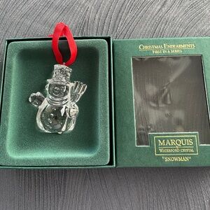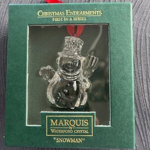 Both ornaments in their original boxes. Snowman is the 1st in the "Christmas Endearments" series. Per the box, the Cherub was made exclusively for Amway. It is my belief that other Cherubs were released holding different instruments. This is "Cherub with Trumpet". Neither of these ornaments have a date stamp. The original Waterford sticker is located on the bottom of Snowman and the box of the Cherub.