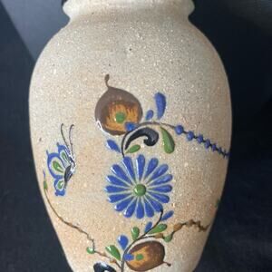 Pair of Mexican Mid 20th Century Sand Finish Pottery Vases. Hand painted blue flowers with butterflies.