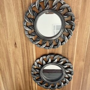 These lightweight plastic brushed silver mirrors are great fort accents for any room. The chain loop design is contemporary and fits almost any style! They are 9 3/4 inches round.