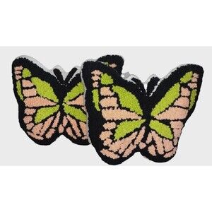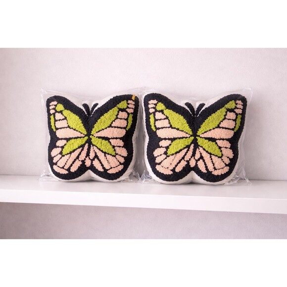 These decorative pillows feature a bold butterfly shape with a textured hooked design in black, green, and blush tones. They add a fun pop of color and personality to a sofa, bed, chair, or teen room.
