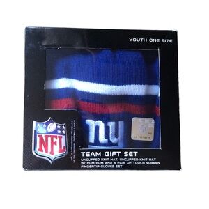 A set of two Giants winter hats for kids. One as a beanie and the other a pom pom beanie. Originally part of a 3pc gift set but is now a 2pc set, with one new hat and one lightly used hat (like new). The hats sold/shipped with the box shown.