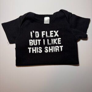 The pictures pretty much say it all here! The gray one (Do You Even Lift) does not show a size, but it fits like a 0-3 months. The black one (I'd Flex But I Like This Shirt) is 3-6 months. These were worn just a few times by my son before he outgrew them. They show minimal signs of wear. Pet free, smoke free home.