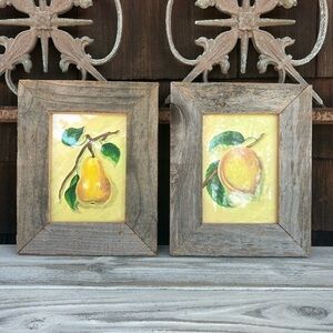 Set of Two Vintage Original Oil Paintings in Handmade Reclaimed Wood Frames. Pear and Peach Paintings by Lydie.
