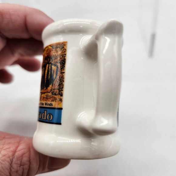 One is beige ceramic mug shaped with colorful scenes from the Colorado Springs area
