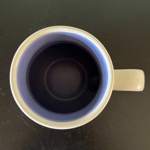 Set of 2 Pfaltzgraff Off-white stoneware mugs in Rio pattern featuring ribbed detailing and hand painted light and medium blue wide band stripes with thin deep blue stripes. Beautiful deep blue interior. (Rio in Spanish means river or stream.) Measures 4” tall with a 3.25” diameter. Holds 14 fluid oz. Microwave and dishwasher safe.