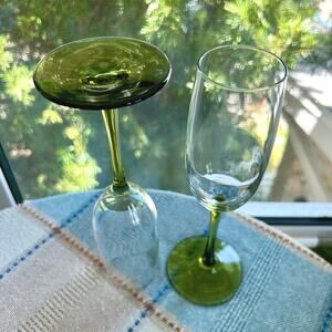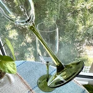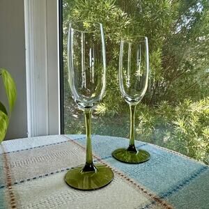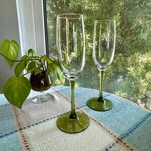 Pair of Pier 1 Pantiago champagne flutes featuring clear bowls with olive green stems and bases. Their elegant design makes them perfect for intimate toasts or as a stylish addition to any barware collection.