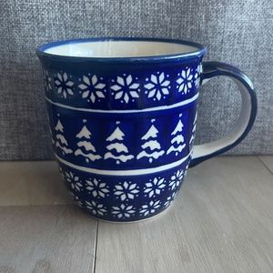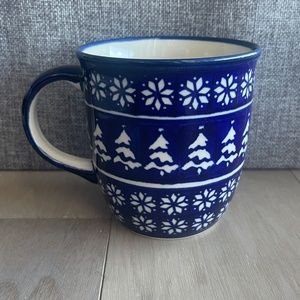 โ Anthropologie Polish Hand-crafted Nordic Blue Evergreen Cozy Winter Mug