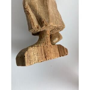 This set of 2 primitive hand-carved wooden figurines is a beautiful example of early folk art/tramp art, likely dating back to the 1930-1940s (or possibly earlier). These figurines depict women carrying crops, showcasing the simple charm and rustic artistry of country life.