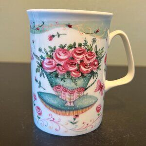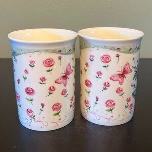 Set of 2 vintage Rose of England fine bone china cup /mug with a lovely all-over pink and red tea rose pattern. One side features a large bouquet of roses in a decorative green and pink teacup and saucer shaped container surrounded by butterflies in hues of pink. Stylish slanted handle. Measures 4.25” tall with a 2.75” diameter; 4.25” across including handle. Holds 11 fluid oz. Made in the United Kingdom.