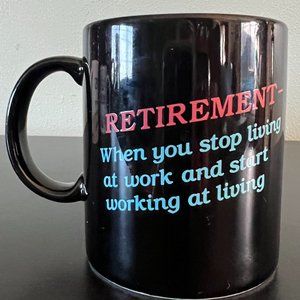 Mug 2) Black ceramic mug with colorful text on both sides that reads: Retirement ~ When you stop living at work and start working at living.