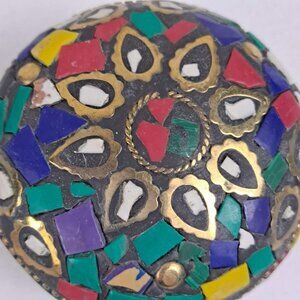 This pair of trinket boxes are both covered in flat, multi color stones with gold accents. Lids are removable. The boxes are lined in black felt. Lightweight. Use to hold small items - such as jewelry or rubber bands - give as a gift - or use as a gift box itself. Endless possibilities.