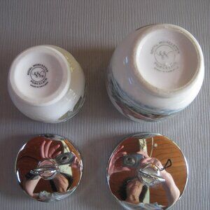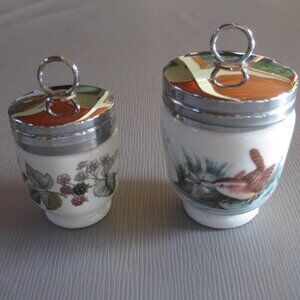 Pair Royal Worcester Egg Coddlers Woodland Birds Wren and Finch 3.25 inch tall, and Berries 2.75 inches tall Vintage. Excellent condition with no chip or cracks; top shows slight signs of use.