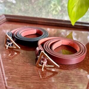 Set of two stylish skinny belts in black and brown faux leather, each featuring a modern gold-tone triangle buckle. These minimalist belts are perfect for cinching dresses, pairing with jeans, or adding a sleek accent to cardigans and tunics.