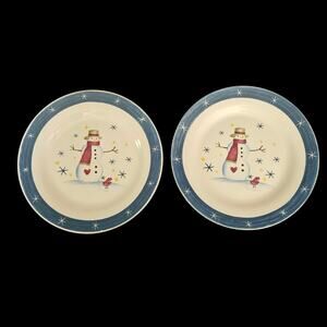 Set of 2 Snowman Christmas Dinner Plates 10.5" Blue Rim Holiday Winter Dinnerwar