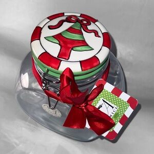 - Retro design clear glass canisters with Painted Ceramic Tops (Red with green Christmas Tree & white with Red & Green Christmas Tree