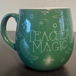 Set of 2 heavyweight, rounded, ceramic TEACHER MAGIC Mugs from St. Nicholas Square. Hunter green mug with white text on both sides that reads, "Teacher Magic" against a background of sun, crescent moon, and stars graphics. Measures 4.25” tall with a 3.5” diameter; 5.25” across including handle. Dishwasher safe. Holds a whopping 20 fluid oz.