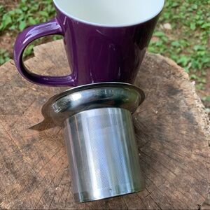 Teavana Angle infuser is in great condition and includes an extra-fine 0.3 mm gauge stainless steel infuser. The purple ceramic mug has a capacity of 15 oz. and is microwave and dishwasher safe, but keep your infuser away from the microwave! - original infuser comes with a lid, but I no longer have it Teavana Poinsettia travel tumbler has a capacity of 10 oz. It was slightly used and it has some areas where the paint is faint. Please see all pictures carefully
