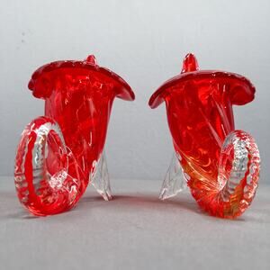 TITLE: Set of 2 VTG Murano Sommerso Jack in Pulpit Cornucopia Red Clear Vase Japan 8"