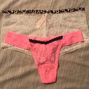 brand new with tags Victoria's Secret pretty pink all lace thong with cut out design on front and white crochet shortie/ minishort duo. Super cute! Cute combo, both in size M.