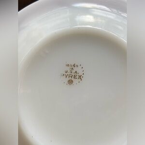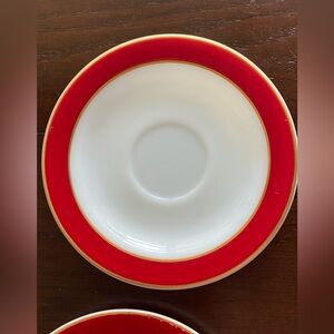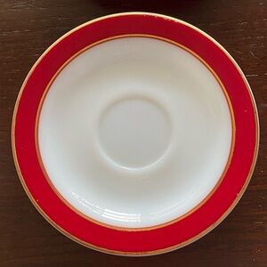 Set of 2 Vintage 1950s Pyrex Milk Glass saucers with red and gold rom. Some minor gold wear but the red is vibrant. No chips or cracks