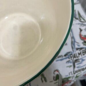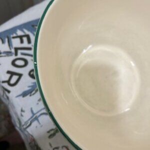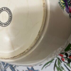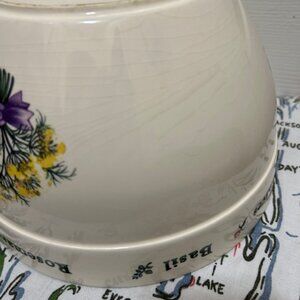 Pre-loved set of 2 mixing bowls with herb designs. There are some light scratches on the large bowl but they are surface; please see pictures. There is some normal wear on the inside of both bowls and there are pictures showing that as well. There is one small chip on the lip of the large bowl.The height of the large bowl is 6 inches and the the diameter at the top is 9.75 inches. The bottom of each bowl is narrower than its diameter. The height of the small bowl is 4.5 inches and the diameter is 7 inches. These are approximate measurements. They are pretty bowls and if I wasn't downsizing I would keep them.