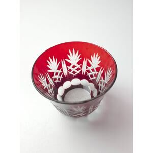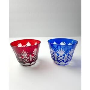 Set of 2 Vintage Edo Kiriko Hand Cut Blue & Red Cut to Clear Glasses W Box