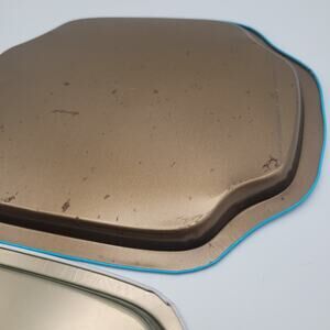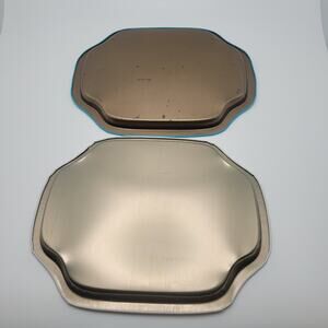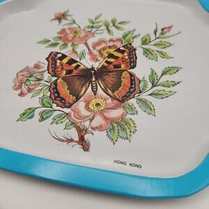Charming pair of vintage metal trays featuring soft floral prints and scalloped edges. One tray displays a detailed butterfly surrounded by roses with a vibrant blue rim, while the other shows a pastel bouquet on a soft white background. Both are lightweight and ideal for decorative use or cottagecore kitchen styling. Some light wear on the back consistent with age, one small flaw on the white tray.