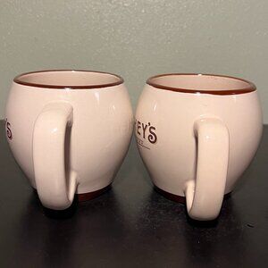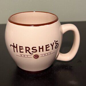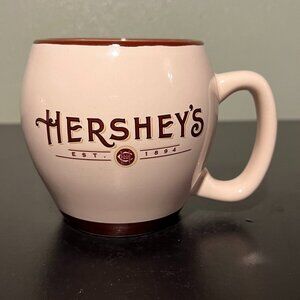 Set of 2 vintage, heavy-duty, wide-mouth, rounded, cream colored ceramic mugs with fancy shadowed font that reads HERSHEY’S above smaller text that reads, EST 1894. Brown rim and matching base border. Large and comfortable easy-to-grip handle. Microwave and dishwasher safe. Measures 4” tall with a 3.25” diameter; 5.5” across including handle. Holds 16 fluid oz. © The Hershey Company