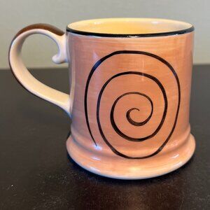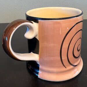 One mug features a white spiral design on a onyx black background on one side with a dark brown spiral design on a tan background on the reverse side. The other mug features narrow dark brown and white horizontal stripes that widen as they go from top to bottom. The other side features a large dark brown square with a white border outlined in dark brown against a tan background.