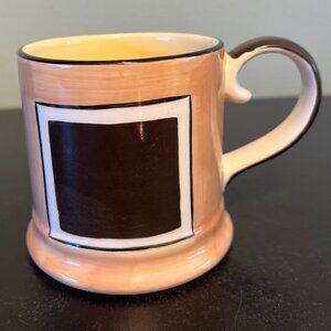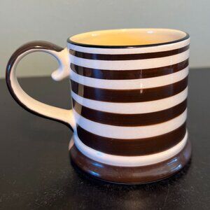 Both mugs have muted yellow interiors, dark brown brims, ribbed pedestal bases, and stylish dark brown and white handles. Measures 3.75” tall with a 3.25” diameter; 5” across including handle. Holds 12 fluid oz. No chips, cracks, or crazing, except for crazing on the underside of one mug. See close up photo..