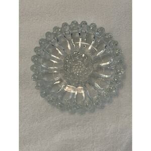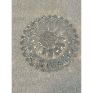 Add a touch of Mid-Century Modern charm to your home decor with this set of two vintage Hazel Atlas candle holders. These candle holders feature a beautiful sunflower pattern with scalloped edges and are made of clear pressed glass. They are suitable for taper or dinner candles and are perfect for any room in your house.