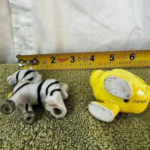 For all you miniature collectors out there, here are 2 adorable little beasties! The yellow chick has that typical chalkware feel, with a little paint loss on the tip of her tail feathers. The zebra is more of a porcelain pottery feel. Both made in Japan, both vintage.