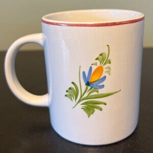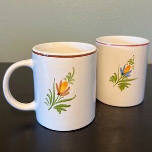 Set of two vintage off-white ceramic mugs, each with a different hand painted sprig image of colorful rooster amid greenery on one side and a floral image on the other. Mauve pink rim border and accented handle. Measures 3.75” tall with a 3” diameter; 4.75” across including the handle. Holds 12 fluid oz. Green sticker on underside of one mug reads: j. willfred A Division of The Charles Sandek Import Company, Inc. Made in Portugal.