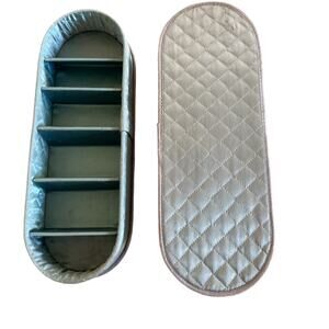 CONDITION: Pre-owned very good vintage; Slight discoloration on lid bottom. Blue Satin quilted fabric in very good condition: no holes, snags, or stains.